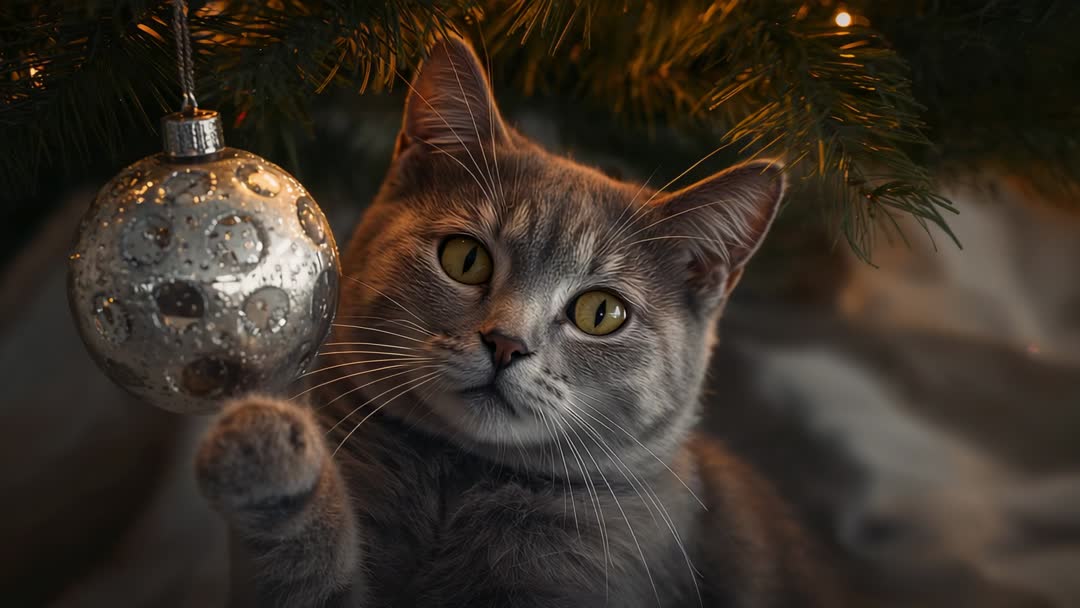 AI Generated Image. Close-up video showing gray tabby cat pawing silver bauble hanging from low Christmas tree branch. Warm string lights creating soft bokeh background and golden highlights on fur. Cat presenting curious expressions and gentle pawing motions that convey playful holiday mood. Working well for holiday campaigns, greeting cards, social media reels, pet blog posts, online store banners, vet clinic seasonal advice, seasonal safety tips. Clip working well as looped short clip or slow-motion cutaway in longer edits. Color grading suggestions using warm tones, gentle vignette, subtle grain for cozy home feel. Suggestions for use include adding festive text overlay, pairing with cheerful music, inserting into countdown videos, using as hero shot for pet product promotions, and illustrating holiday pet safety articles.