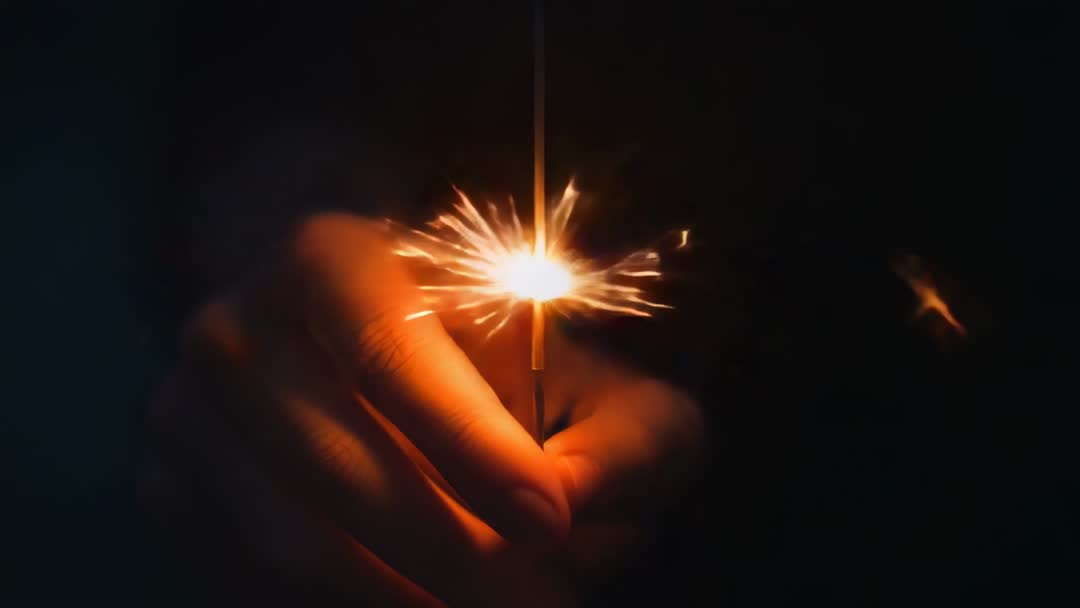 AI Generated Image. Showing close-up video of hand lighting sparkler at night, capturing bright burst of sparks and warm amber glow against dark background. Shot focusing on fingers and spark detail, creating intimate, cinematic moment. Use for celebration and holiday content, party promotions, event opener, social media reels, greeting card animations, or background for title sequences. Suggest using slow-motion playback, looping short segment, and warm color grading to enhance glow. Pair with light crackle sound for immersive effect or overlay text for seasonal marketing and safety tips. Suitable for editorial pieces about traditions, DIY party planning, and fireworks safety demonstrations.