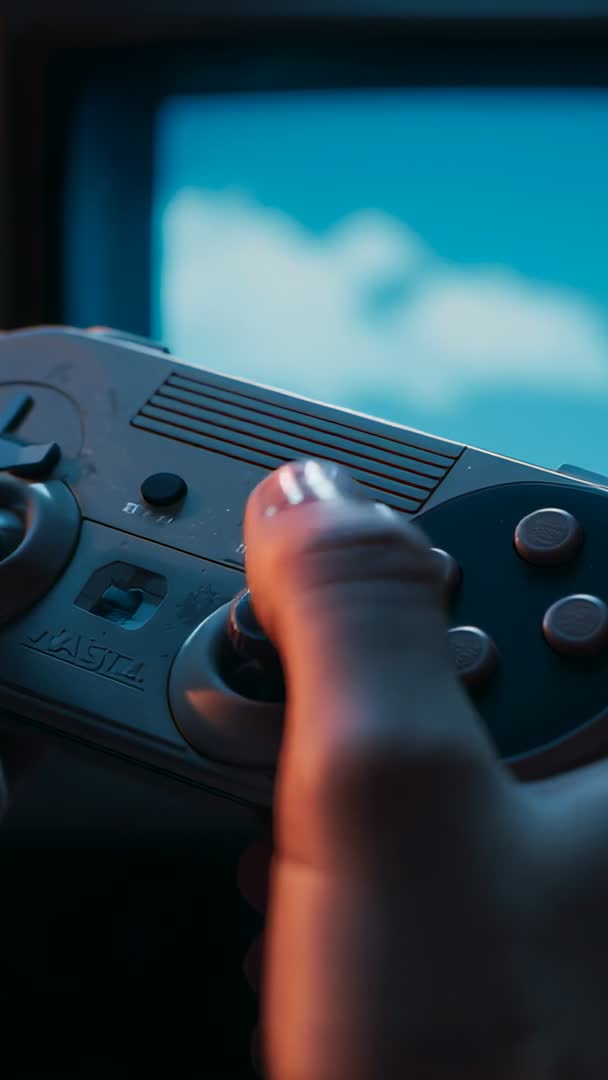 AI Generated Image. Video showing close-up of hand gripping retro joystick controller while navigating game with blurred sky on screen in background. Warm cinematic lighting and shallow depth of field creating moody, immersive atmosphere. Vertical orientation optimizing mobile and social playback. Use for gaming channel intros, mobile game ads, streamer backgrounds, tech product demos, retro gaming articles, tutorial sequences, app store promo clips. Ideal for adding text overlays, motion graphics, lower-thirds, vertical ad formats, social stories, and promotional reels.