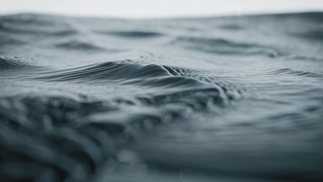 AI Generated Image. Showing tight close-up of ocean surface, gentle waves forming low crests and producing delicate ripples and scattered bubbles. Featuring shallow depth of field and soft blue-gray palette with moody horizon line fading into distance. Offering loopable continuous motion ideal for ambient video backgrounds, meditation and relaxation content, social media loops, website hero banners, and broadcast lower thirds. Working well for environmental campaigns, travel content, mindfulness apps, corporate branding, product overlays, and cinematic transitions. Pairing with subtle wave sound design or ambient pads for immersive experience. Available in high-resolution, slow-motion compatible clip for seamless looping and color grading.