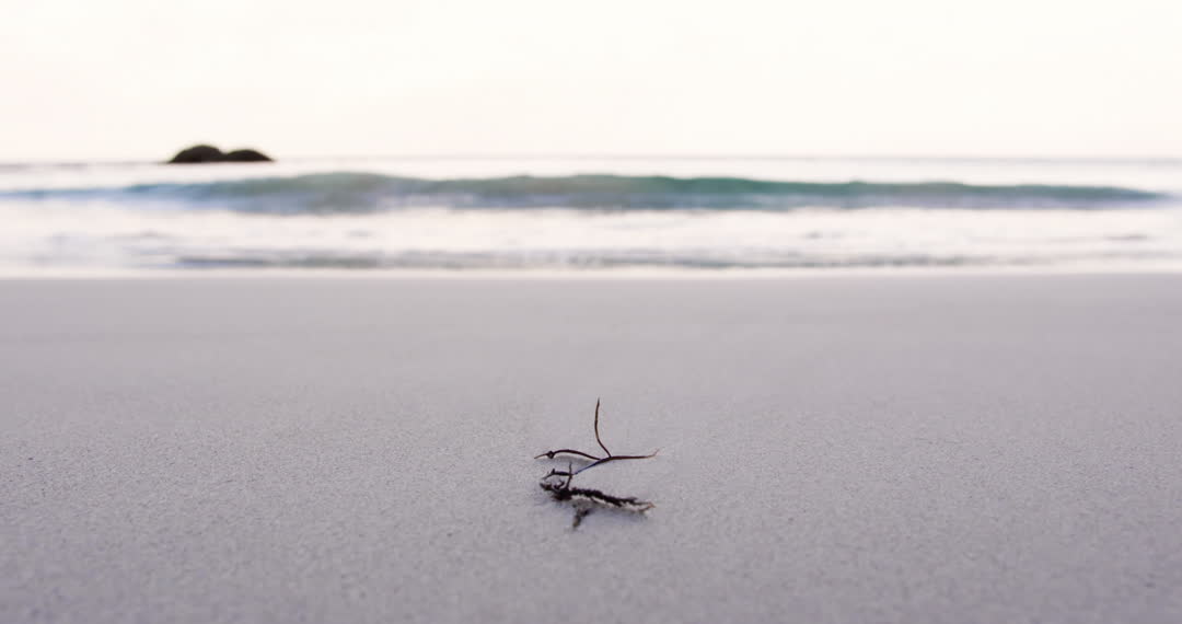 Close-up shot of fragile branch on beach with gentle waves in background, creates a sense of peaceful reflection. Ideal for projects emphasizing serenity, nature's simplicity, or minimalism online.