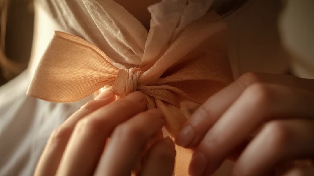 - Close-Up of Hands Tying Peach Ribbon Bow at Collar