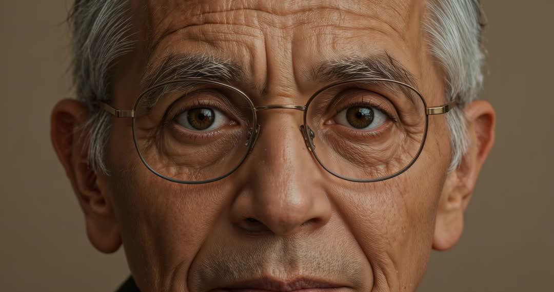 AI Generated Image. This depiction shows a senior male holding a gaze with round metal eyeglasses, embodying depth and contemplation. It spotlights maturity and wisdom accumulated over years. Useful in projects highlighting aging gracefully, life reflections, or discussing collective life experiences and personal narratives. Perfect for articles exploring themes of longevity, wisdom, or calm assertiveness.