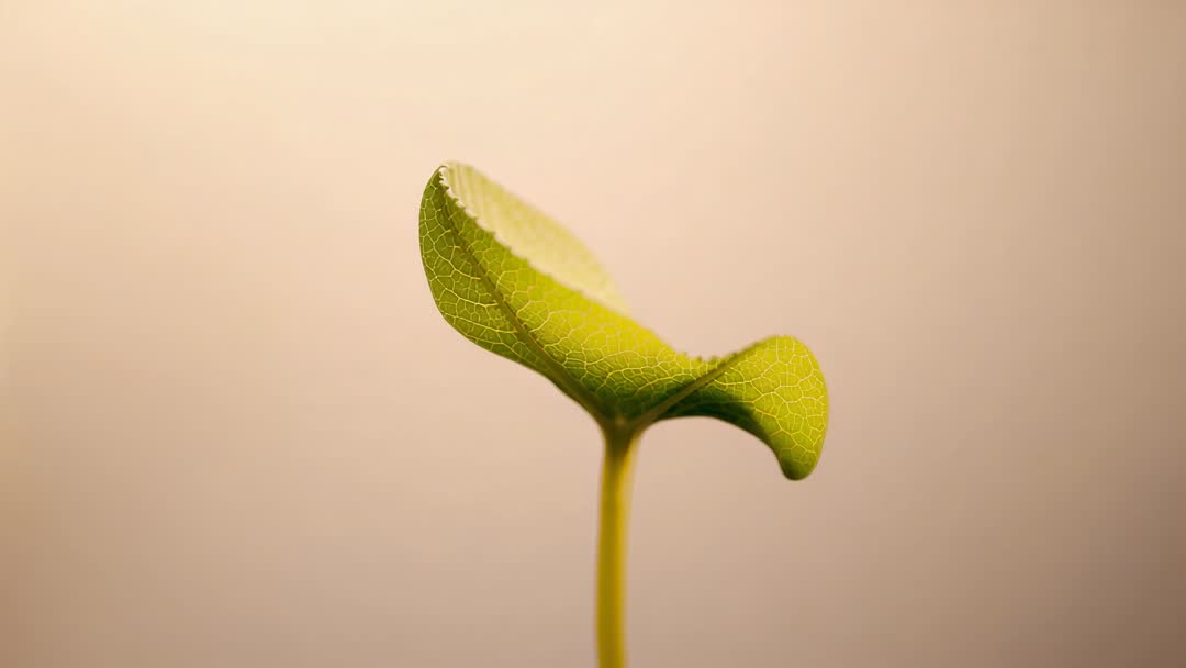AI Generated Image. Featuring single green seedling drifting slightly due to subtle camera movement against warm beige background. Soft studio light highlighting delicate leaf veins and translucent green tones. Close-up framing and shallow depth of field creating gentle bokeh and minimalist composition. Helping convey concepts of growth, new beginnings, sustainability, natural wellness and gentle care. Ideal for website hero banners, social media reels, environmental campaign clips, wellness and spa branding, botanical education videos, product packaging for organic or plant-based goods, corporate presentations on growth or startup pitches. Editing ideas: applying warm or cool color grade, looping for seamless background animation, adding soft ambient music for calming context, pairing with uplifting narration or motivational text overlays.