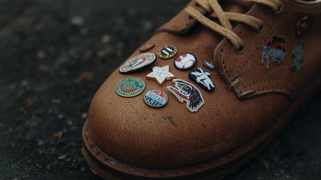 AI Generated Image. Showing cinematic close-up of brown leather work boot adorned with enamel pins, shot on wet pavement with moody lighting and shallow depth of field to emphasize texture and detail. Highlighting enamel pin designs, worn leather, and frayed laces, creating authentic rugged and streetwear mood. Working well for lifestyle and fashion videos, accessory promos, brand storytelling, social media reels, music video b-roll, and editorial cutaways about personalization or DIY crafts. Serving as strong opener or product-detail clip for e-commerce listings, blog hero footage for urban style articles, or background visual for commercials and title sequences.