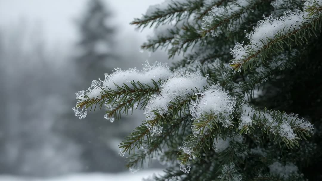 AI Generated Video. Displaying close-up video of frosted fir branch melting, forming delicate ice crystals and clear droplets on green needles against soft-focused winter forest background. Snow clinging to branch slowly thawing, releasing droplets catching light and creating sparkling highlights. Shallow depth of field and muted cool tones creating tranquil, atmospheric mood with ample copy space on left side. Suiting nature documentaries, seasonal commercials, holiday greetings, and environmental awareness pieces. Working well as calming intro or transition clip in video productions, looping background for wellness or meditation apps, and visual accent for winter product marketing. Complementing text overlays, title cards, and voiceover narration. Offering high-resolution footage for slow-motion edits and macro detail studies.