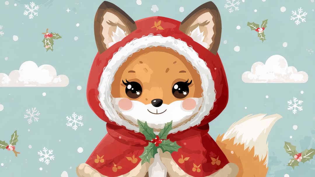 AI Generated Video. Showing close-up video frame of cute fox wearing red hooded cloak with white fur trim and holly clasp, smiling and facing camera against pale teal backdrop with falling snowflakes and scattered holly sprigs. Conveying warm, whimsical, family-friendly holiday mood through large expressive eyes, rosy cheeks, and soft painterly texture. Working well for holiday greeting card animation, seasonal social media post, children's book trailer, festive product packaging, and classroom holiday presentation. Suiting designers who are creating seasonal banners, hero headers, animated stickers, printable gift tags, or greeting video loops. Delivering high-resolution frame, ready for cropping and compositing into video timelines or motion graphics. Including editable color palette compatibility for brand integration and clear text overlay space near top and bottom.