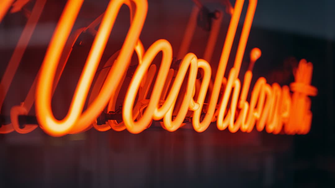 AI Generated Image. Close-up video showing glowing orange neon tubing with focus pulling across curved glass letters, revealing mounting wiring and support brackets. Warm orange glow and shallow depth of field creating dramatic bokeh and abstract light streaks, making footage versatile for background loops and overlay elements in motion design. Suggested uses include advertising for bars, restaurants, retail, nightlife branding, editorial on signage design and retro trends, and how-to tutorials for neon installation or repair. Footage working well for social media reels, website hero loops, broadcast lower thirds, and cinematic opening shots to set moody urban atmosphere.
