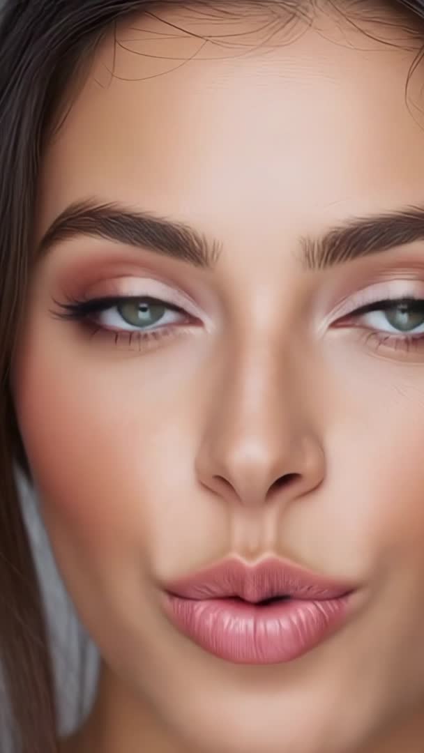 AI Generated Image. Featuring close-up vertical video of woman performing lip-sync and conveying playful emotion through subtle pout and soft gaze. Soft studio light highlighting smooth skin, defined brows, and natural makeup. Offering tight framing for strong visual impact and easy cropping to square or horizontal formats. Suggesting use for social media reels, beauty tutorials, cosmetic campaigns, influencer promos, app intros, or lifestyle content. Recommending adding upbeat music, on-screen captions, and brand overlays to boost engagement. Useful for makeup brand ads, beauty blogs, influencer portfolios, short-form storytelling, and promotional content seeking intimate expressive footage.