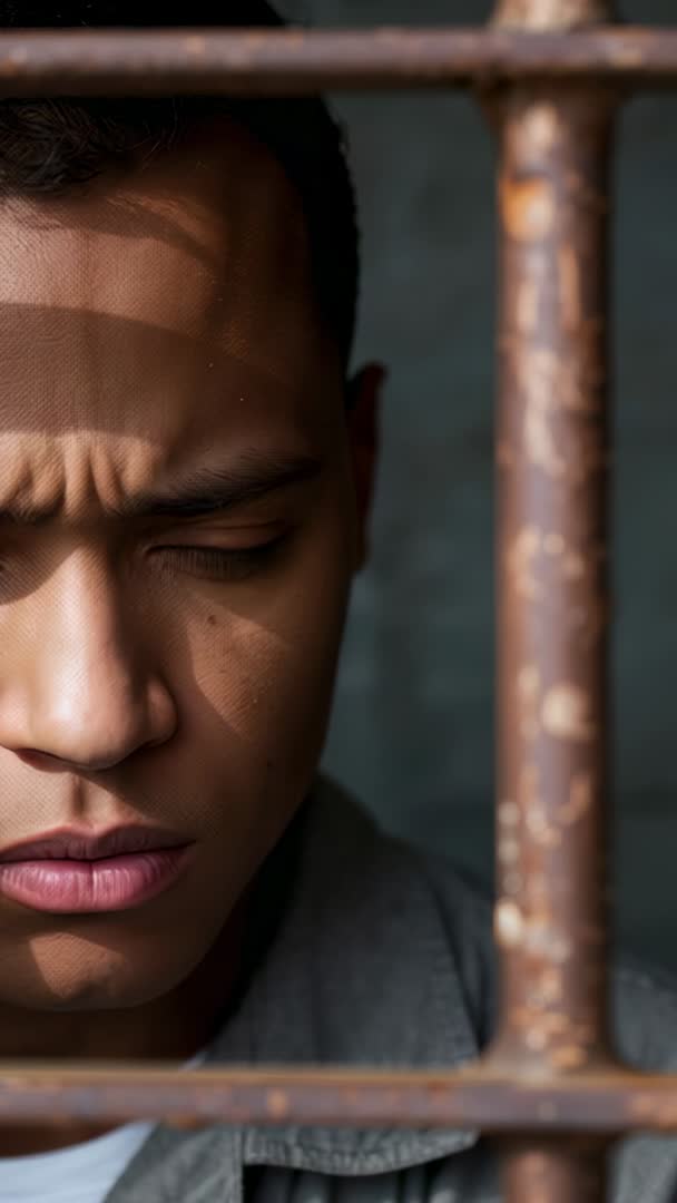 AI Generated Image. Vertical close-up video showing young man peering through rusted metal bars, shifting gaze and furrowing brow while shadows cross face. Composition placing rusted bar in foreground and leaving tight negative space on one side, creating strong sense of confinement and emotional tension. Lighting highlighting skin texture and rust details, evoking cinematic, gritty mood. Ideal for use in mental health awareness, criminal justice and prison reform content, documentary sequences, news storytelling, emotional advertising, and book or poster art requiring somber, introspective tone. Pairing with subdued color grade and subtle ambient soundscape or voiceover is enhancing dramatic impact. Keeping vertical frame for mobile-first platforms and creating close-cut edits for social media reels, stories, or short-form documentary clips is recommended.