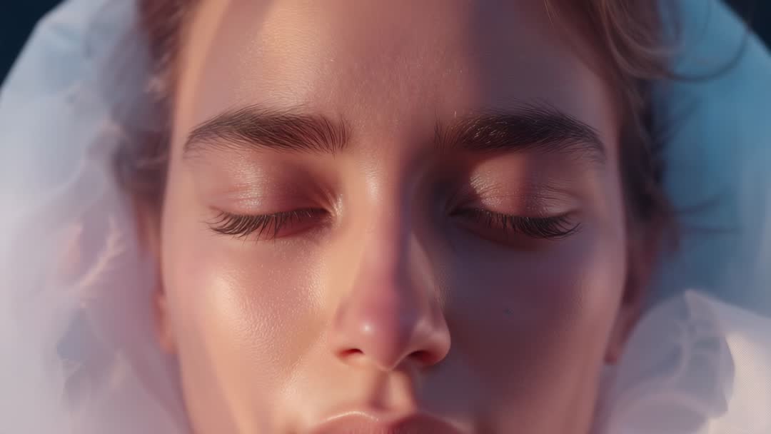 AI Generated Video. Showing closeup of model holding eyes closed and parting lips while resting on ruffled white fabric cushion. Highlighting natural skin texture, long eyelashes, subtle makeup, and soft cinematic glow. Pulling-back camera movement revealing gentle fabric folds and studio light falloff. Conveying calm, intimacy, relaxation, beauty, and quiet confidence. Ideal for beauty commercial, skincare product spot, makeup tutorial background, spa promotion, wellness video, and editorial fashion sequence. Working well as hero clip, social media loop, website banner, product ad, or cinematic transition. Suggesting warm glow or cool blue contrast grading to enhance mood. Pairing with overlay text, logo reveal, voiceover, or slow-motion edit for dramatic effect. Including AI-generated tag for stock labeling and creative tech projects.