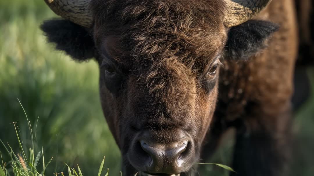 AI Generated Image. Video clip showing closeup of bison lowering head and grazing on dew-covered grass in sunlit meadow, wet muzzle visible and fur texture detailed. Frame capturing horn tips, expressive eyes, and slow chewing motion, creating intimate wildlife moment. Footage working well for nature documentaries, conservation campaigns, educational content about grassland ecosystems, travel promotions for national parks, editorial stories on wildlife management. Use as opening shot for wildlife sequence, cutaway for grazing behavior, background for rustic outdoor product ads, or stock clip for environmental presentations. Color grading options include warm sunrise tones or muted documentary palette. Suitable for widescreen editing, slow-motion playback, or tight crop for vertical social content.