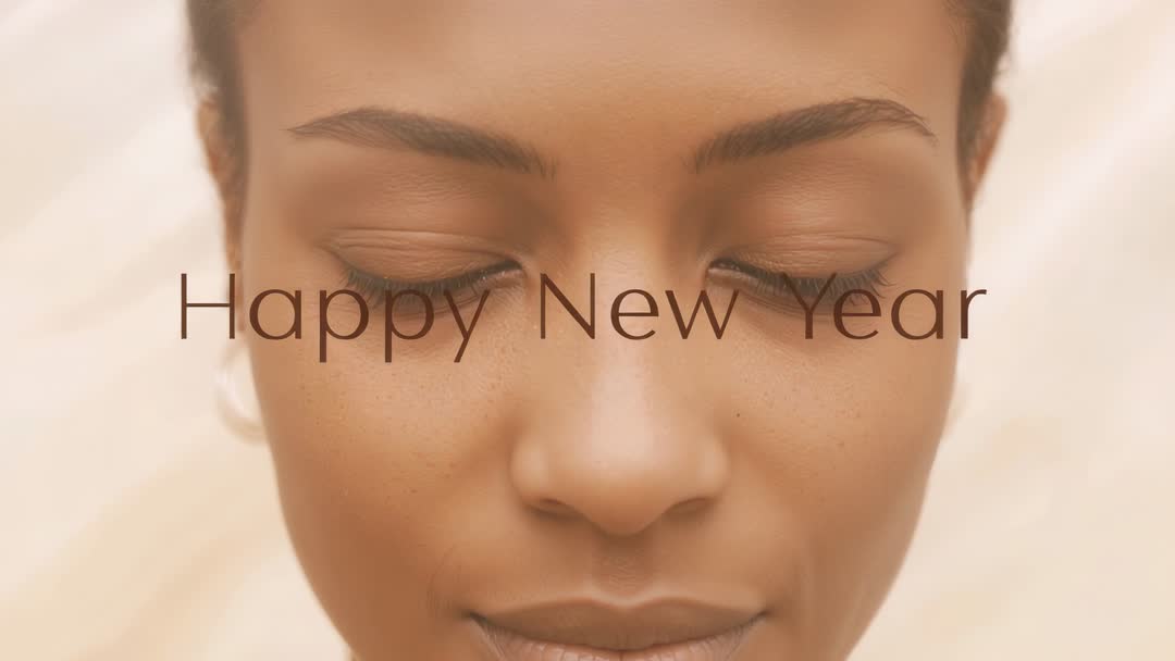 - Closeup calm woman closing eyes and smiling while Happy New Year text appears in warm soft glow