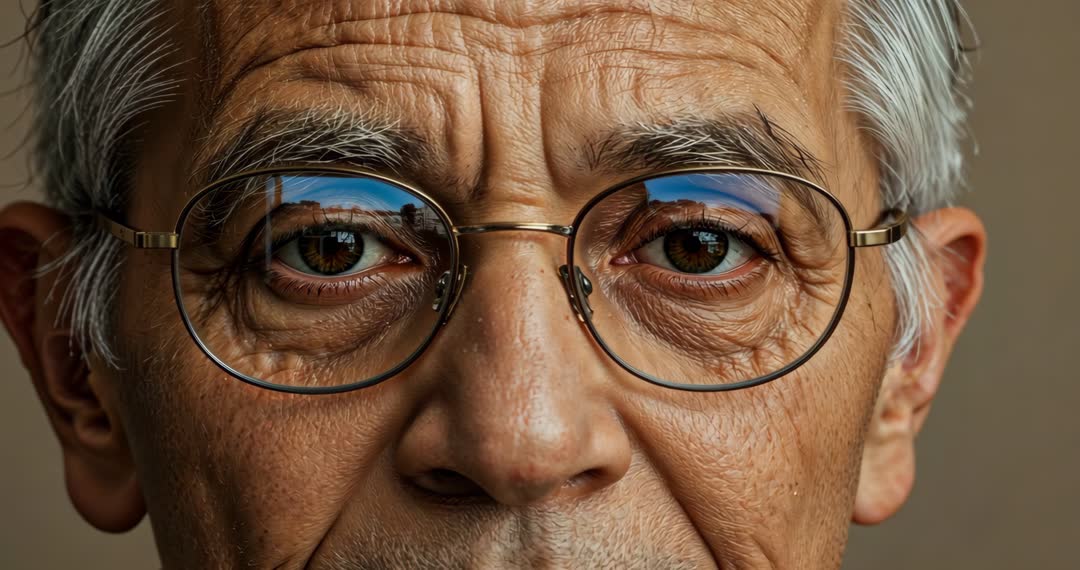 AI Generated Video. The video features a detailed close-up of a mature man's face, with his attention gradually shifting direction. His glasses reflect a serene sky, creating a captivating visual contrast with the intricate facial textures that come with age. Ideal for use in creative projects highlighting introspection, maturity, or AI-generated art, supplying content related to senior living, diversity, and storytelling through visuals.