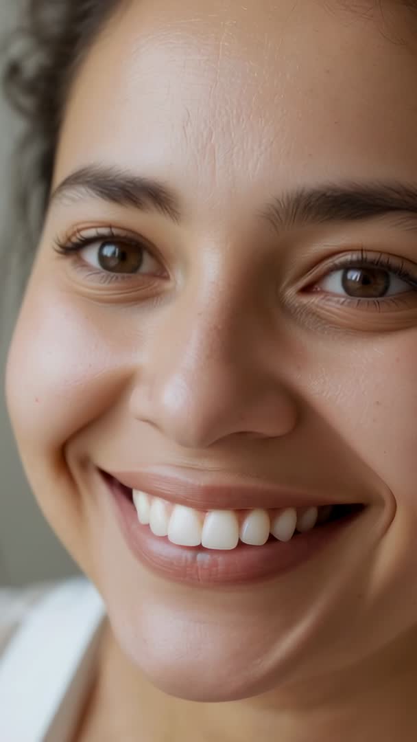AI Generated Video. Vertical closeup video showing young woman with curly hair smiling and widening into big grin while making direct eye contact with camera. Frame focusing on face, teeth, eyes, and natural skin texture, with white strap of top remaining subtly visible. Soft even lighting and neutral background keeping attention on expression and smile dynamics. Clip working well for dental clinic ads, oral care product promos, cosmetic and skincare campaigns, social media reels, influencer content, testimonial segments, lifestyle branding, and happiness or mental health messaging. Serving as intro clip for landing pages, app onboarding, background B-roll for commercials, hero shots for social posts, or thumbnail for video content. Color grading and cropping easily adapting to portrait or square formats.