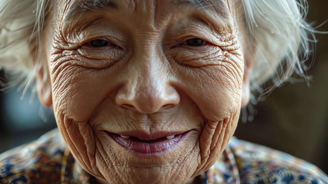 AI Generated Video. Closeup video showing smiling elderly woman with white hair leaning toward camera, capturing warm gentle smile and deep facial wrinkles. Floral blouse collar visible, providing subtle color contrast and lifestyle detail. Lighting presenting warm tones and soft shadows, emphasizing skin texture and emotional warmth. Footage working well as B-roll for senior care campaigns, retirement community promotions, healthcare outreach, aging gracefully features, human interest documentaries, intergenerational storytelling, beauty and skincare for mature skin, lifestyle blogs, social media content, and editorial spreads. Editing suggestions: crop tight for emotional impact, use slow dissolve for gentle mood, apply warm color grade to enhance skin tones, add soft ambient music for uplifting atmosphere. Licensing note: ideal for commercial use in print, web, social media, and broadcast; confirm model release when using for commercial projects.