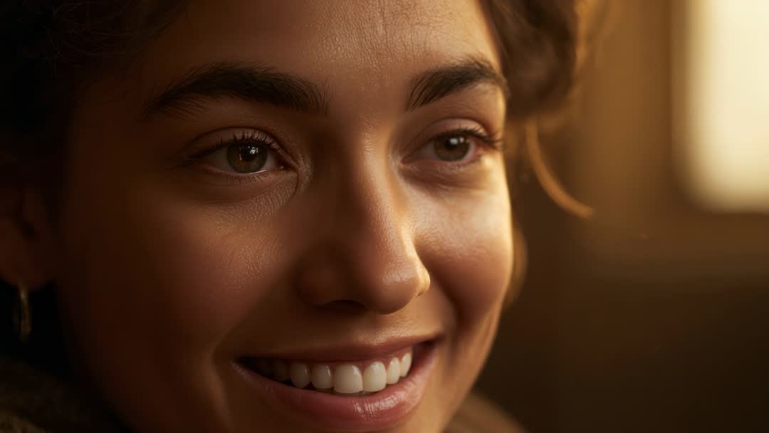 AI Generated Image. Closeup video showing young woman smiling and blinking while reacting to warm window light. Soft golden glow highlighting skin texture and eyes, creating intimate optimistic mood. Hoop earring and knit sweater adding casual cozy style. Serving lifestyle commercials, skincare and beauty tutorials, social media stories, interview B-roll, and wellness brand content. Working well for website hero, banner, ad campaign, thumbnail, and scene transition in promotional videos. Offering color grading with warm tones and gentle contrast to preserve natural skin detail. Providing short loop option for background ambience or trimming to reaction clip for emotional connection moments. Delivering high-resolution frames for editorial, marketing, and product packaging needs.