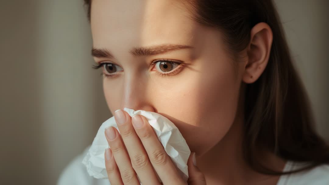 AI Generated Image. Video showing woman holding crumpled tissue to nose while warm sunlight casting narrow band across face. Closeup portrait conveying fatigue, seasonal allergy, mild illness, or quiet emotional moment. Useful for health and wellness content, allergy awareness campaigns, telemedicine landing pages, seasonal flu articles, and mental health stories. Suitable as b-roll clip for commercials, social video, online ads, and editorial sequences. Color palette and soft window light supporting calm, intimate mood and portrait-focused branding. Consider pairing with copy about self care, prevention tips, symptom checklists, or patient testimonials.