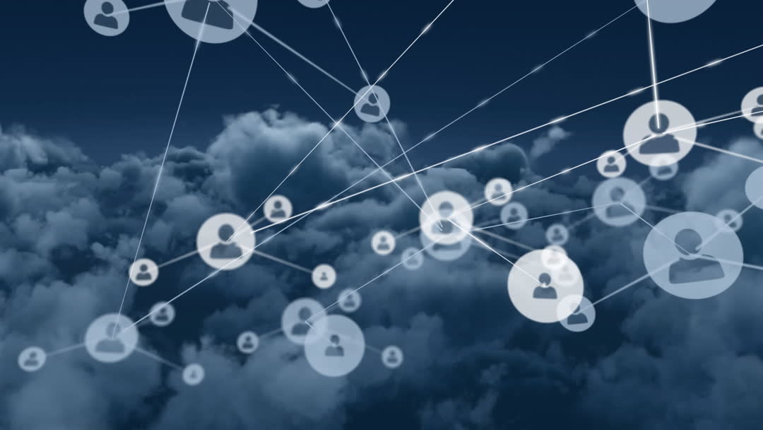 Depicts concepts of cloud computing and global connectivity with a network of connected people icons overlaying a sky filled with clouds. Ideal for illustrating articles or presentations about digital transformation, online networking, cloud infrastructure, IT solutions, or social media communications.