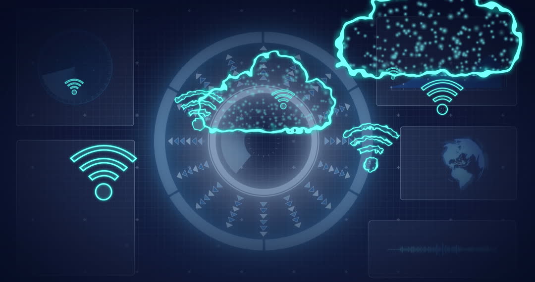 This digital illustration features animated clouds and wifi icons, representing cloud computing and data connectivity on a global scale. The depicted scanning scope suggests continuous data processing and analysis, ideal for illustrating concepts in digital transformation, IT solutions, and modern tech advancements. Use in presentations, websites, or marketing materials focused on networking technology or cloud-based services.