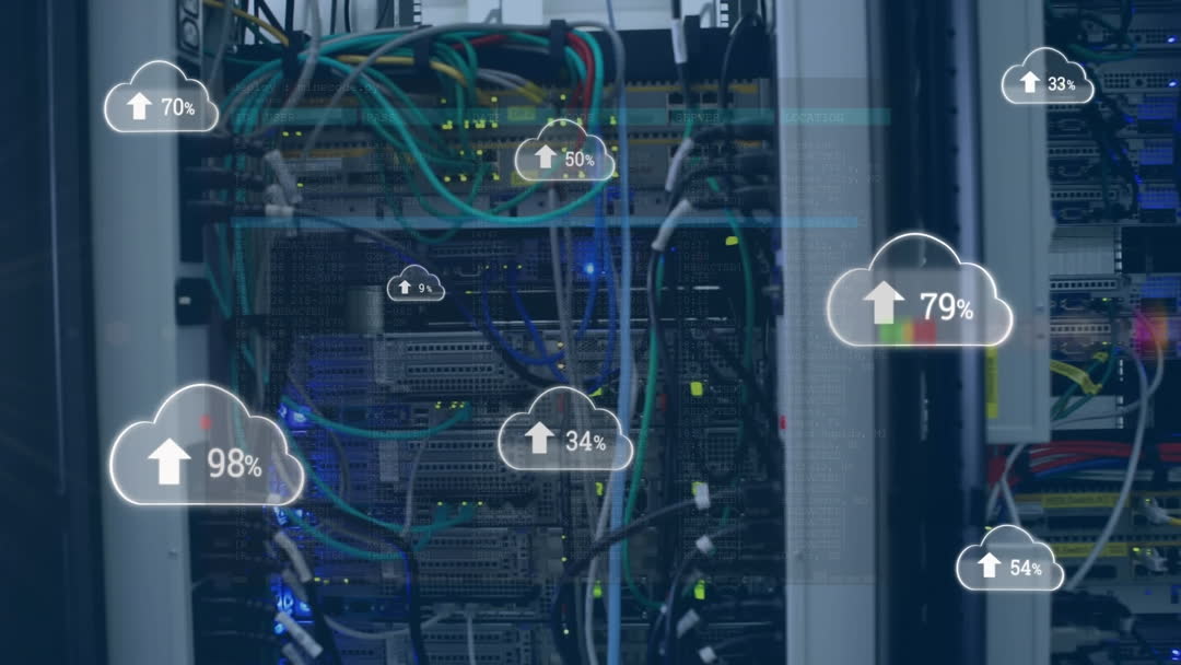 Modern server room filled with network cables and data servers illustrating cloud computing infrastructure. Overlay of digital icons with upload percentages highlights data processing and cloud storage concepts. Ideal for use in topics related to technology, data centers, information technology, and business solutions.