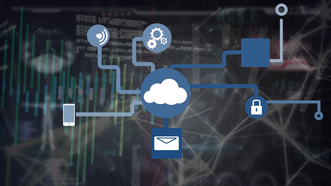 Digital animation showcasing interconnected icons symbolizing cloud computing and network systems over a backdrop of data processing graphics. Useful for presentations related to technology innovations, global data exchange, financial technology, and secure cloud services.