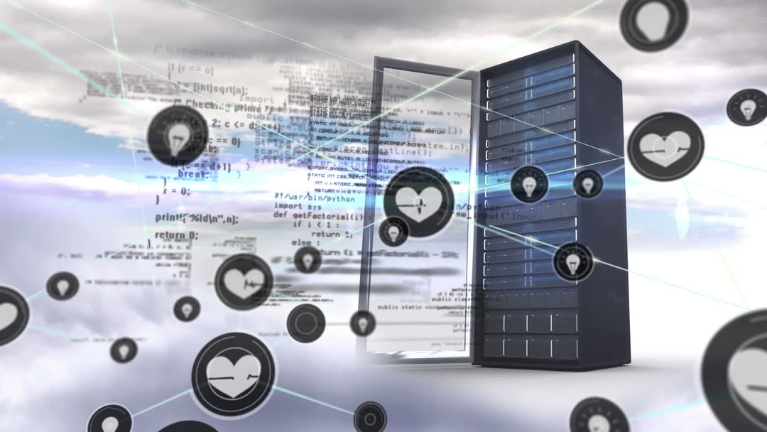 A vibrant digital animation showcasing a server amidst data and icons over a cloudy sky symbolizes the concept of cloud computing. This can be utilized for illustrating technology articles, business presentations, or any topic related to digital networks and data storage. Ideal for illustrating modern IT infrastructure and the seamless connectivity cloud services.