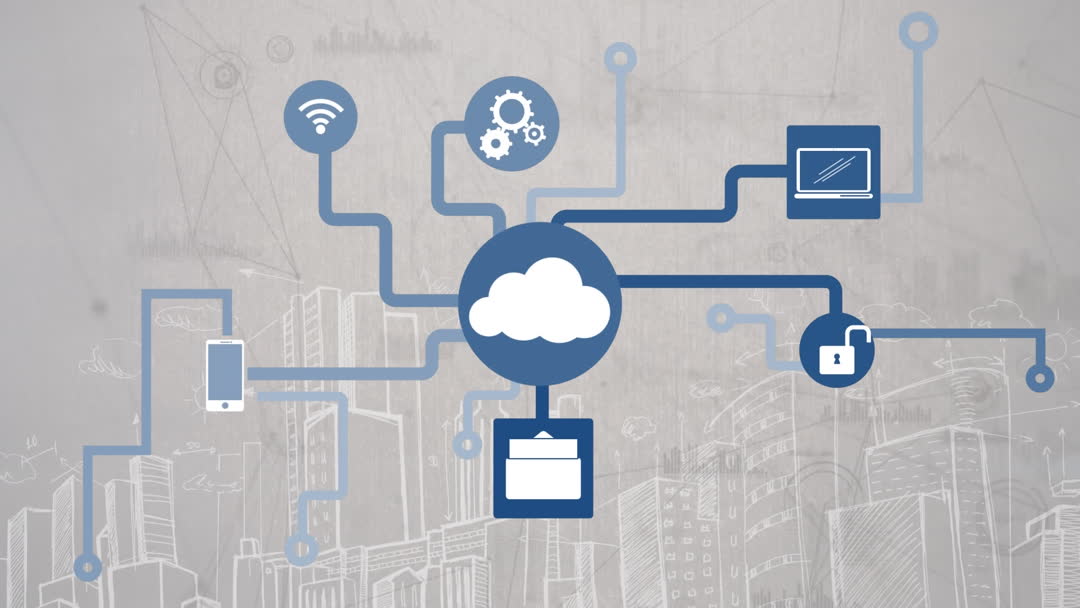 Stylized illustration showing cloud connectivity with technology icons linked to a central cloud over a cityscape backdrop. Useful for presentations on digital transformation, illustrating network infrastructure, showcasing technology advancements, or depicting the complexities of managing connected devices and data within a smart city.