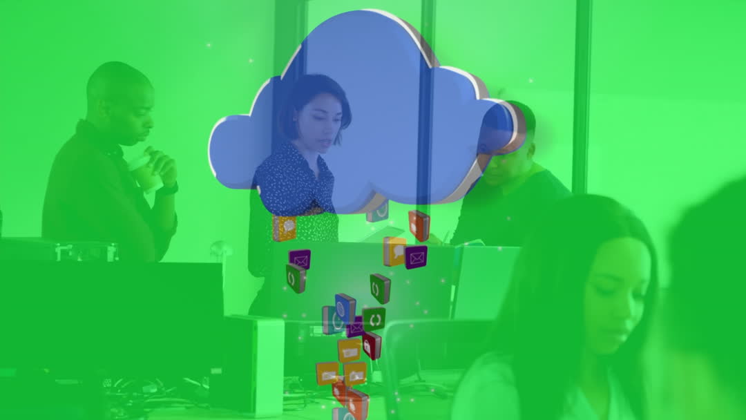 Illustrates cloud technology and its integration in a modern business office. Suitable for presentations about digital transformation, software solutions, cloud services, and innovative business strategies.