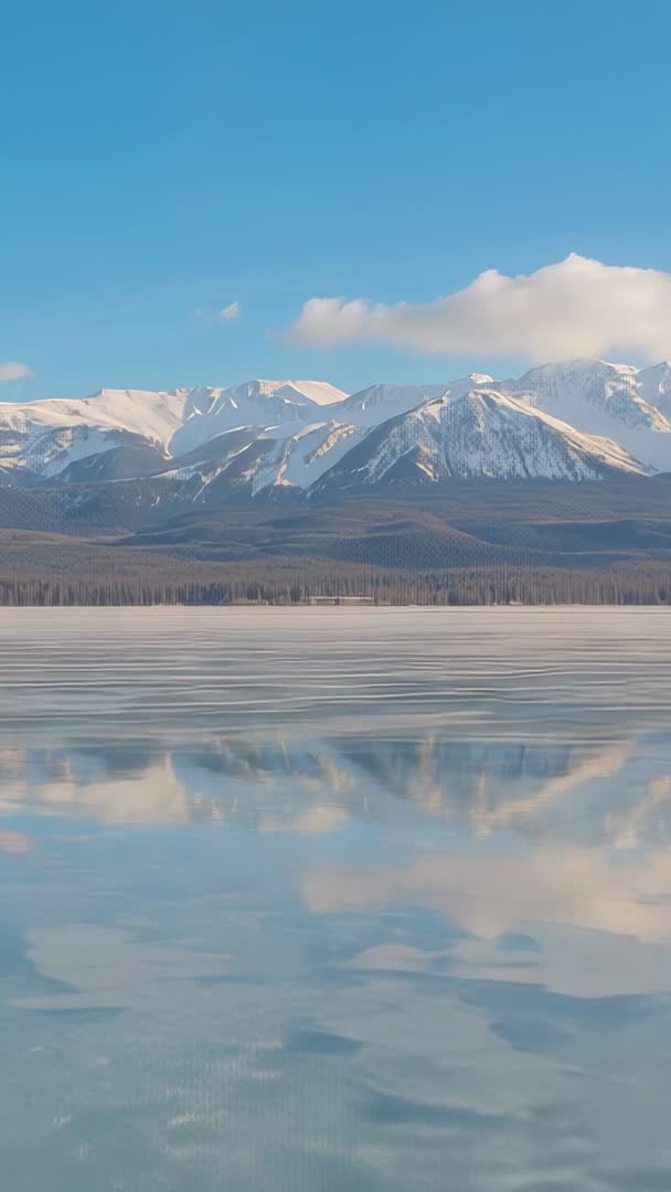 AI Generated Video. Vertical footage showing clouds drifting across snow-capped peaks and reflecting on cracked frozen lake surface. Slow panoramic movement highlighting mirror-like ice reflections, soft pastel sky tones, and rugged alpine contours. Ideal for nature documentaries, travel commercials, landscape backgrounds, social media reels, meditation and wellness content, and environmental campaigns. Footage offering tall vertical composition for smartphone use, fullscreen apps, and vertical storytelling. Licensing suggestions: hero background for website banners, calming loop for app UI, establishing shot for mountain adventure films, tranquil opener for yoga or mindfulness videos. Color palette featuring cool blues, soft whites, neutral grays, and warm golden highlights at sunrise or sunset. Suggested edits: subtle speed ramping, gentle crossfade loops, ambient wind or piano soundtrack, and safe space at top for text or logo overlay.