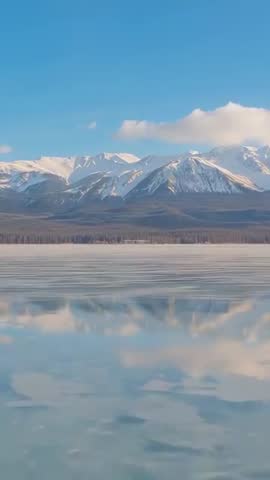 - Clouds drifting over snow-capped peaks reflecting on cracked frozen lake | Vertical video