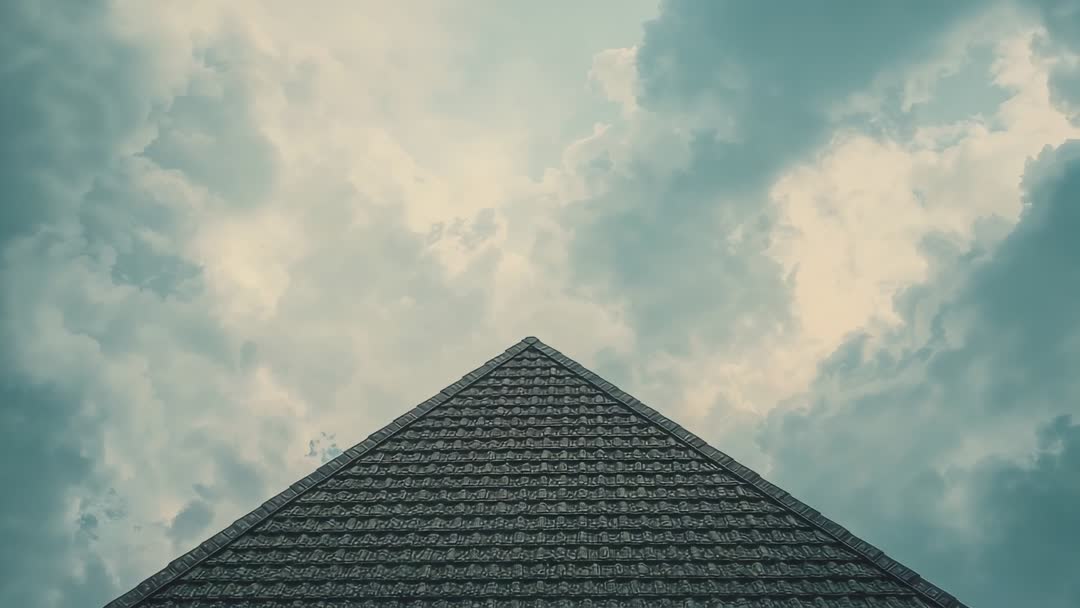 AI Generated Image. This scene showcases the vibrant movement of cloud clusters sweeping across a shingled rooftop positioned outdoors. The video emphasizes the interaction between static architecture and dynamic weather changes while capturing a serene and moody atmosphere. The natural textures of shingles and the cloudy sky make it ideal for backdrops in home architectural presentations, weather-related media, or calming, ambient background usage.