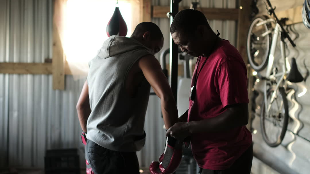 Coach Assists Student with Boxing Gloves in Workout Gym Video