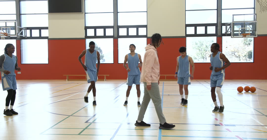 - Coach Directs Basketball Team Warm-Up in School Gym