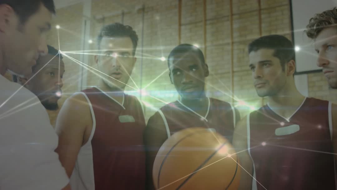 - Coach leading basketball team huddle under futuristic network overlay for unity and focus
