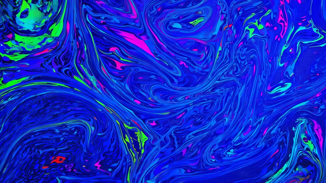AI Generated Image. Showing shearing flow moving liquid pigments into ribbon-like currents across shallow tray, forming cobalt blue, magenta, cyan and neon green swirls. Featuring high-contrast neon highlights and fine marbling textures, delivering hypnotic fluid motion ideal for looping. Offering strong color contrast and rhythmic flow, suitable for tech, music, fashion and creative branding projects. Enhancing website hero backgrounds, motion graphic intros, VJ visuals, club projection, social media stories and album cover animation. Supporting slow-motion playback to emphasize ribbon dynamics, color grading to match brand palette and seamless looping for continuous backdrops. Advising overlaying bold typography or logo with subtle vignette and drop shadow to maintain legibility. Supplying vibrant abstract clip for digital campaigns, editorial spreads, packaging design and textile prints.