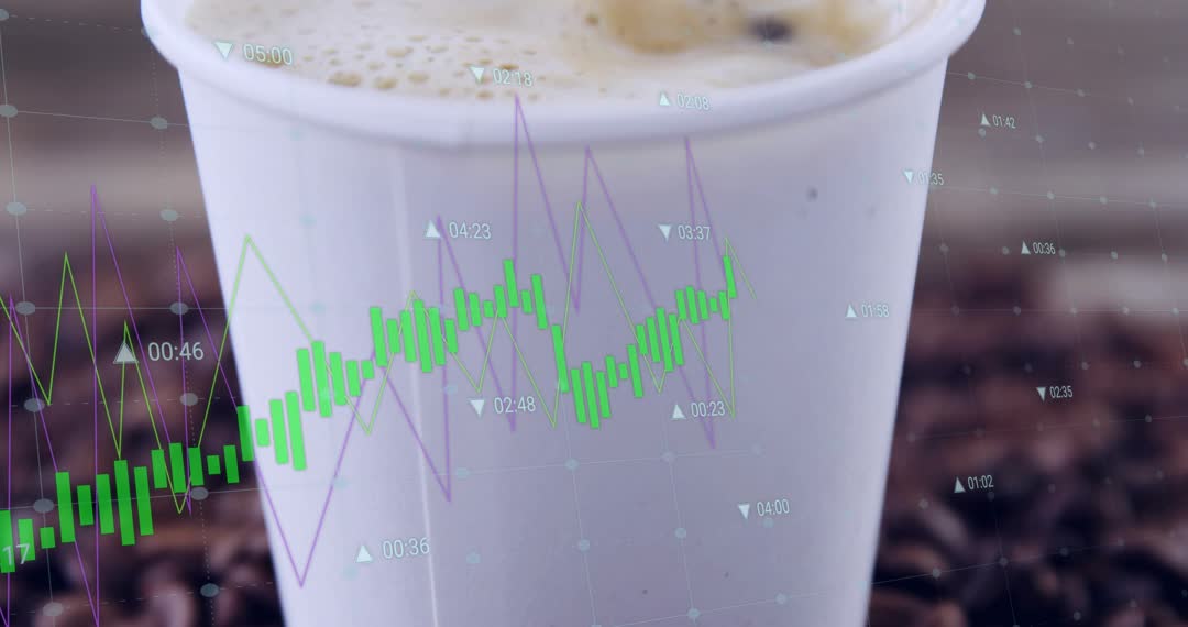 - Coffee Cup with Financial Analytics Overlaid Showing Trends