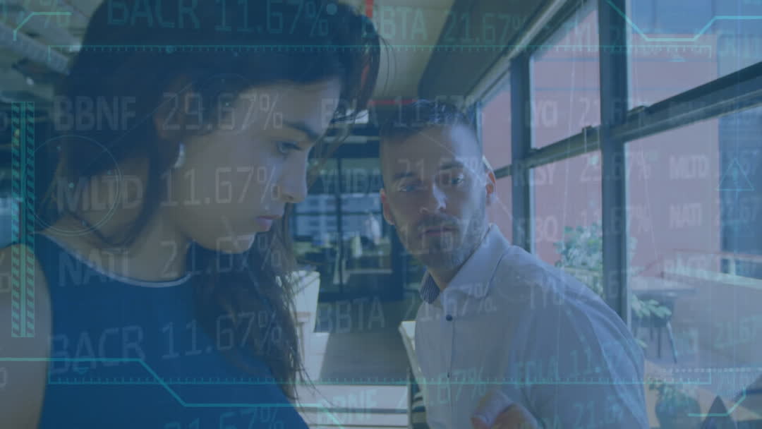 Front-facing video showing two colleagues focused on a laptop. Overlaps with digital display of fluctuating stock market data, highlighting a connection between personal collaboration and global economics. Useful for marketing tech solutions, demonstrating teamwork with financial relevance, suggesting trends analysis resources, or illustrating business strategy visuals in presentations.