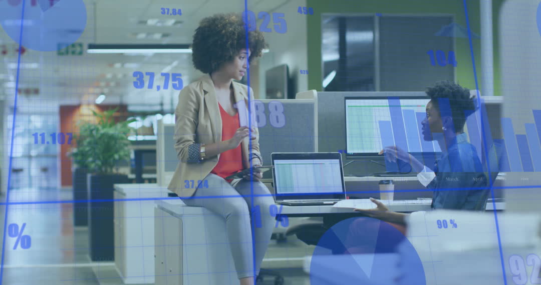 Collaborating in Modern Office Amidst Financial Data Digital Overlay Video