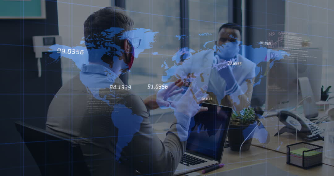Overlapping video of two male office colleagues discussing business while wearing face masks. A digital world map with data overlays highlights global analytics. Ideal for themes related to business analytics, pandemic adjustments, teamwork, and technological advances in corporate environments. Perfect for business solutions content, articles about safe workplace practices, or international commerce strategies.