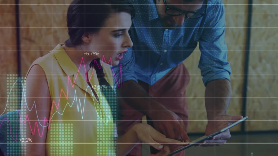 Two business individuals working closely engage with tablet. Financial graphs and statistics overlay suggests dynamic data analysis. Scene displays innovative business solutions and strategic decision-making, ideal for content regarding financial technology, teamwork, and progressive business strategies.