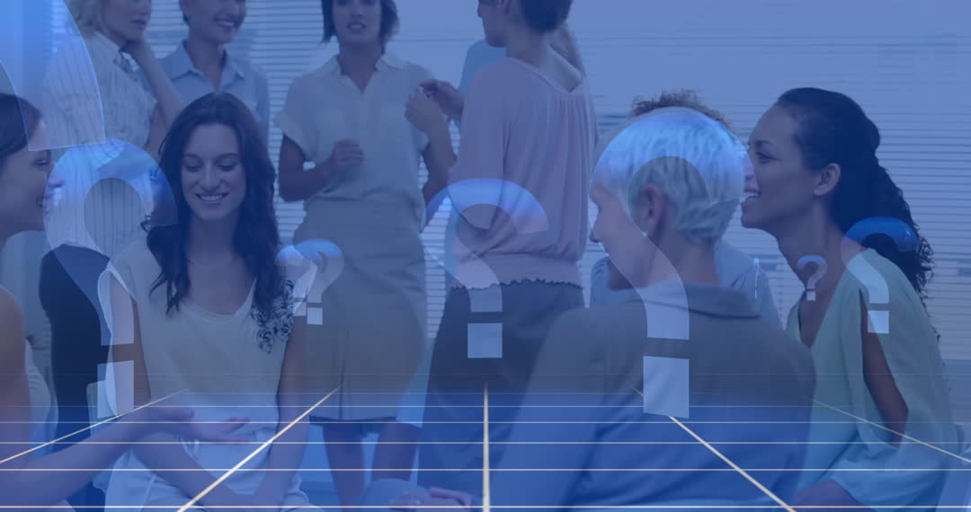 Group of diverse businesspeople smiling and talking in an office environment symbolizing effective communication and teamwork. Overlaid question marks represent problem solving and innovation in a corporate setting. Ideal for use in business communication and teamwork projects highlighting corporate culture and strategic planning.