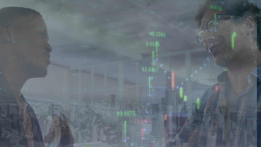 Two business professionals of diverse backgrounds discussing collaboration while digital data overlays city skyline. Useful for themes of global business, financial growth, technological innovation, and multicultural partnerships in modern urban spaces.
