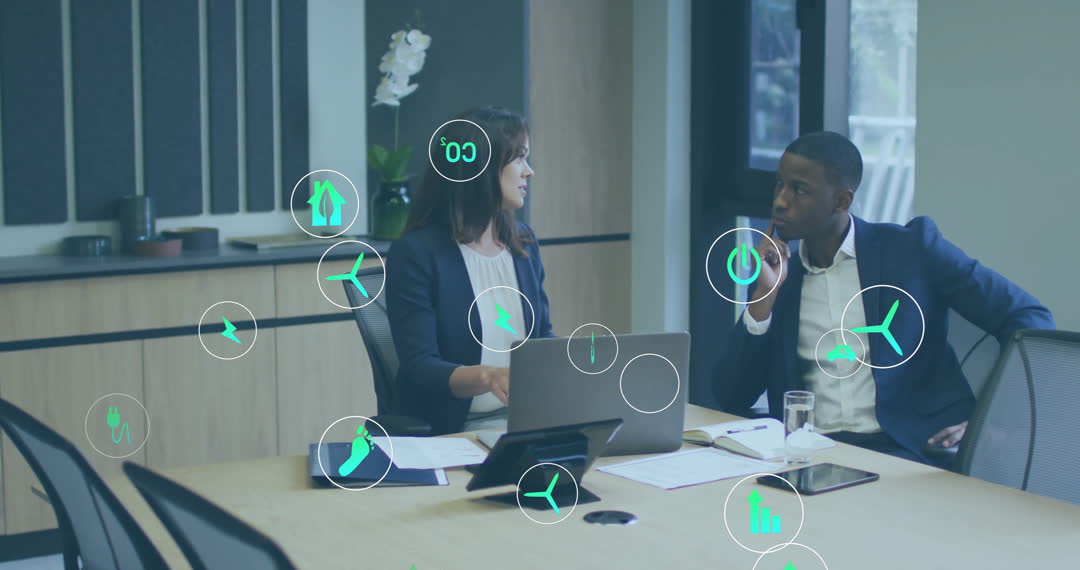 Two professionals in a modern office environment engaging in discussion with sustainability and ecological icons represented digitally. This content can be used for materials focusing on eco-friendly business practices, digital innovation in workplaces, or modern collaborative workspaces.