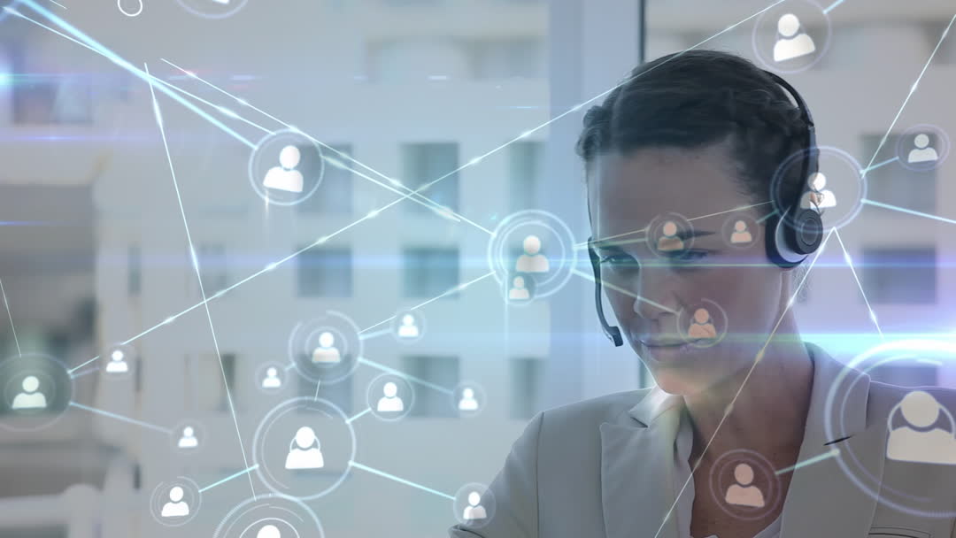 This visualization embodies the concept of global business network, highlighting digital connectivity and collaborative efforts via advanced technology. A professional wearing a headset symbolizes customer support and virtual assistance integral to modern global commerce. Useful for illustrating topics related to telecommunications, global communications infrastructure, customer service technology, or remote workforce dynamics.