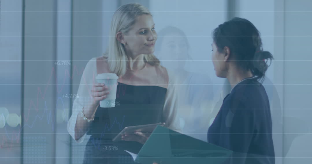 Two diverse businesswomen seen engaging in conversation while surrounded by transparent financial data and digital graphs. This concept representation highlights teamwork and modern business practices within a tech-driven corporate environment. Suitable for illustrating professional collaboration, financial analysis, global business affairs, and digital transformation contexts.
