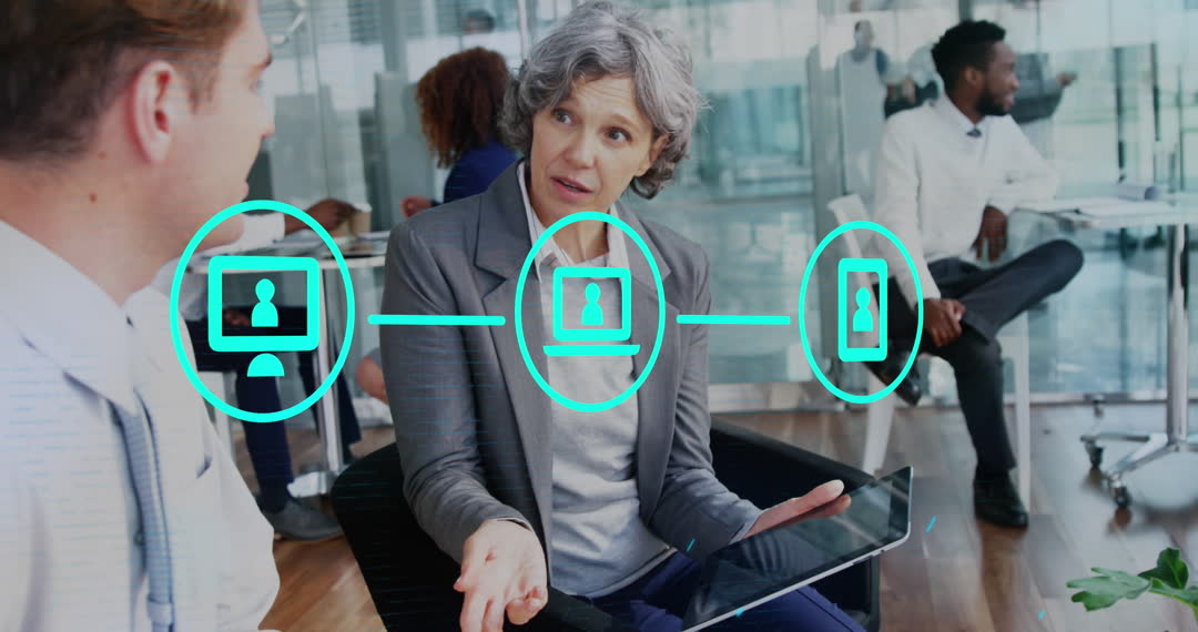 Business environment showing diverse professionals engaged in discussion with digital communication icons overlayed, representing modern office connectivity and teamwork. Suitable for illustrating digital communication in business, global network concepts, teamwork innovation, and modern business solutions.