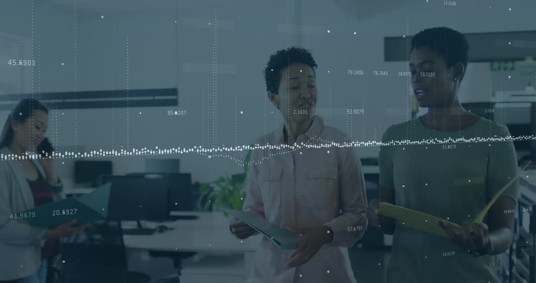 A diverse group of coworkers stands in a modern office environment, holding folders and actively discussing. Overlapping this scene is a digital overlay of fluctuating data lines, representing the dynamic nature of the global financial markets. Ideal for use in presentations about business trends, financial analytics, or corporate strategy slides in order to convey the concept of teamwork and data-driven decision making in fast-paced financial sectors.