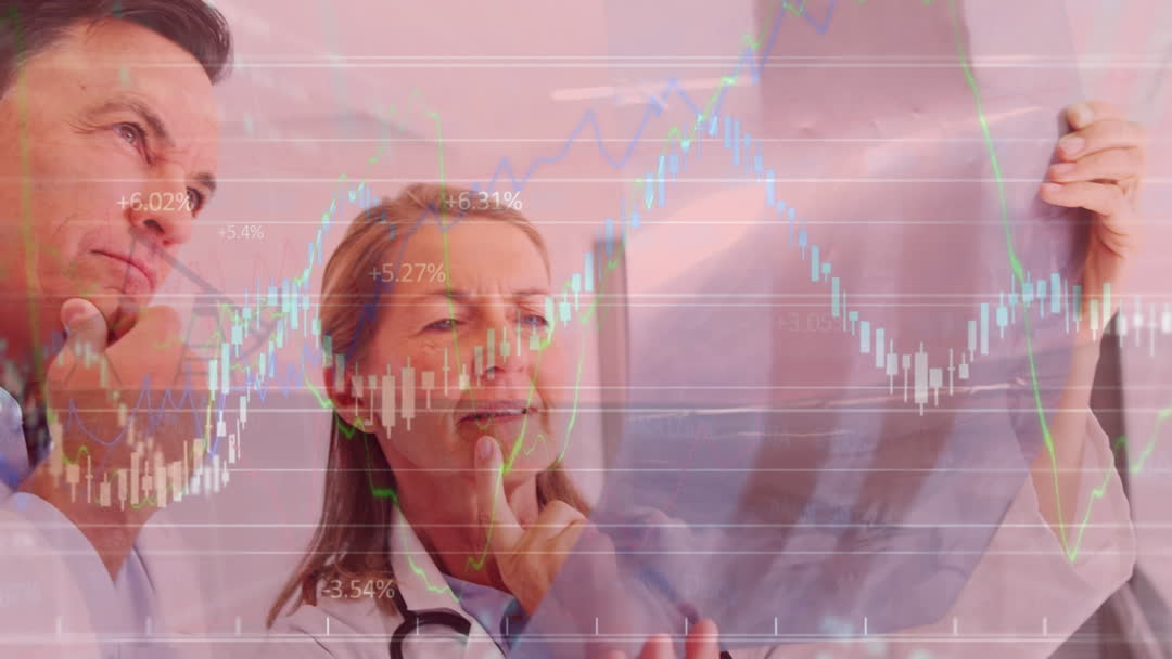 Two medical professionals are analyzing data with holographic stock charts visible in the foreground, emphasizing a synthesis between healthcare and technology. Useful for illustrating concepts of innovation in medicine, digital healthcare strategies, collaborative teamwork in medical analytics, or integration of business insights with healthcare solutions. Ideal for publications focused on future trends at the intersection of technology and medicine.