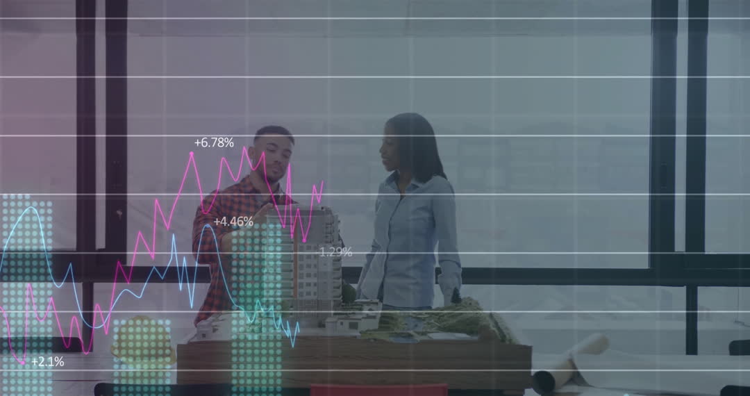 Two professionals are engaging in a business strategy session overlooked by an overlay of financial graphs and statistics. This video represents multicultural teamwork, strategic planning, and analyzing market trends, all integral to global business success. Ideal for illustrating corporate environments, finance-related content, or business consulting service promotions.